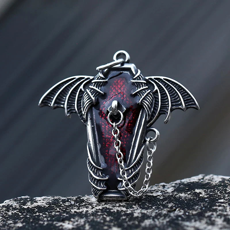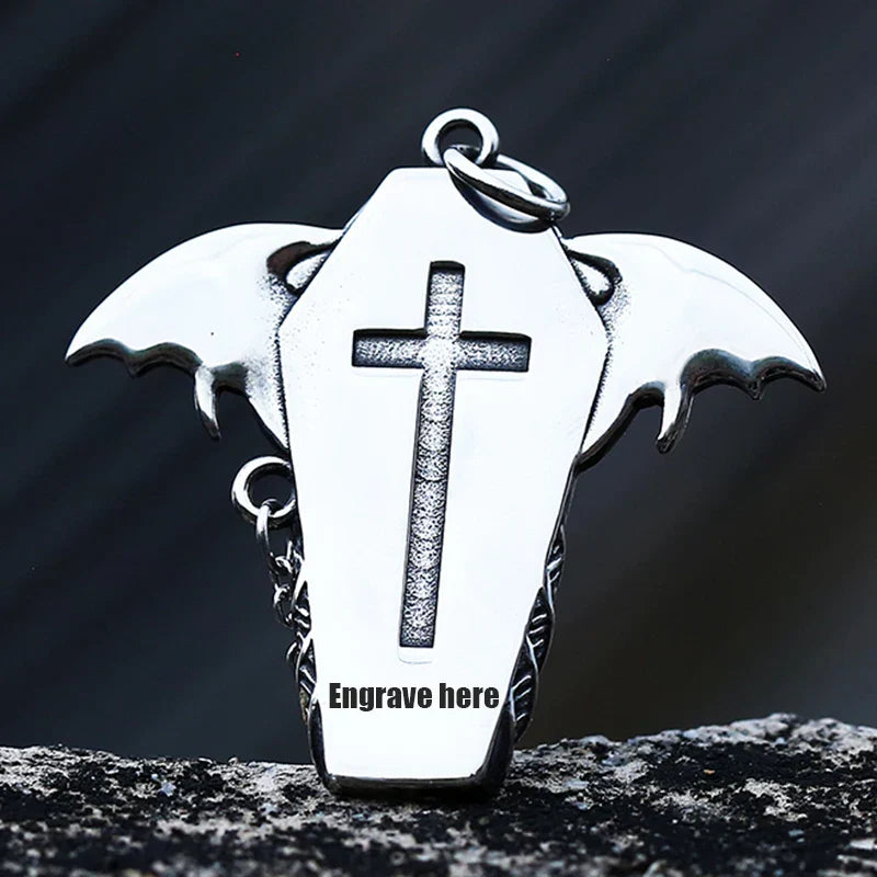 Step into the shadows in style — get your Gothic Coffin with Bat Pendant today and let your dark side shine!