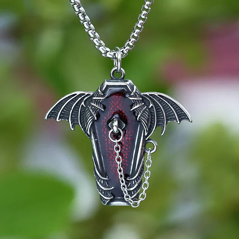 Embrace the dark allure with this Gothic Coffin with Bat Pendant Necklace — a bold accessory for teens, bikers, and punk fashion lovers, perfect as a unique couple gift or gothic statement piece.