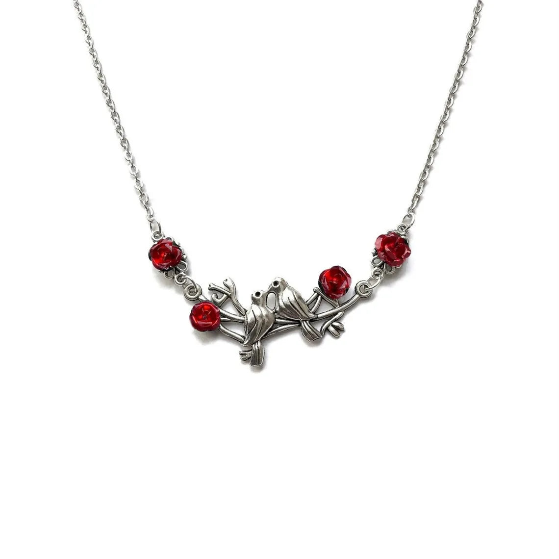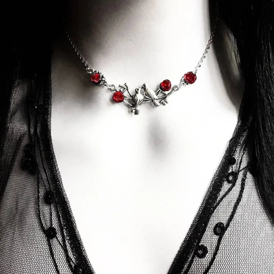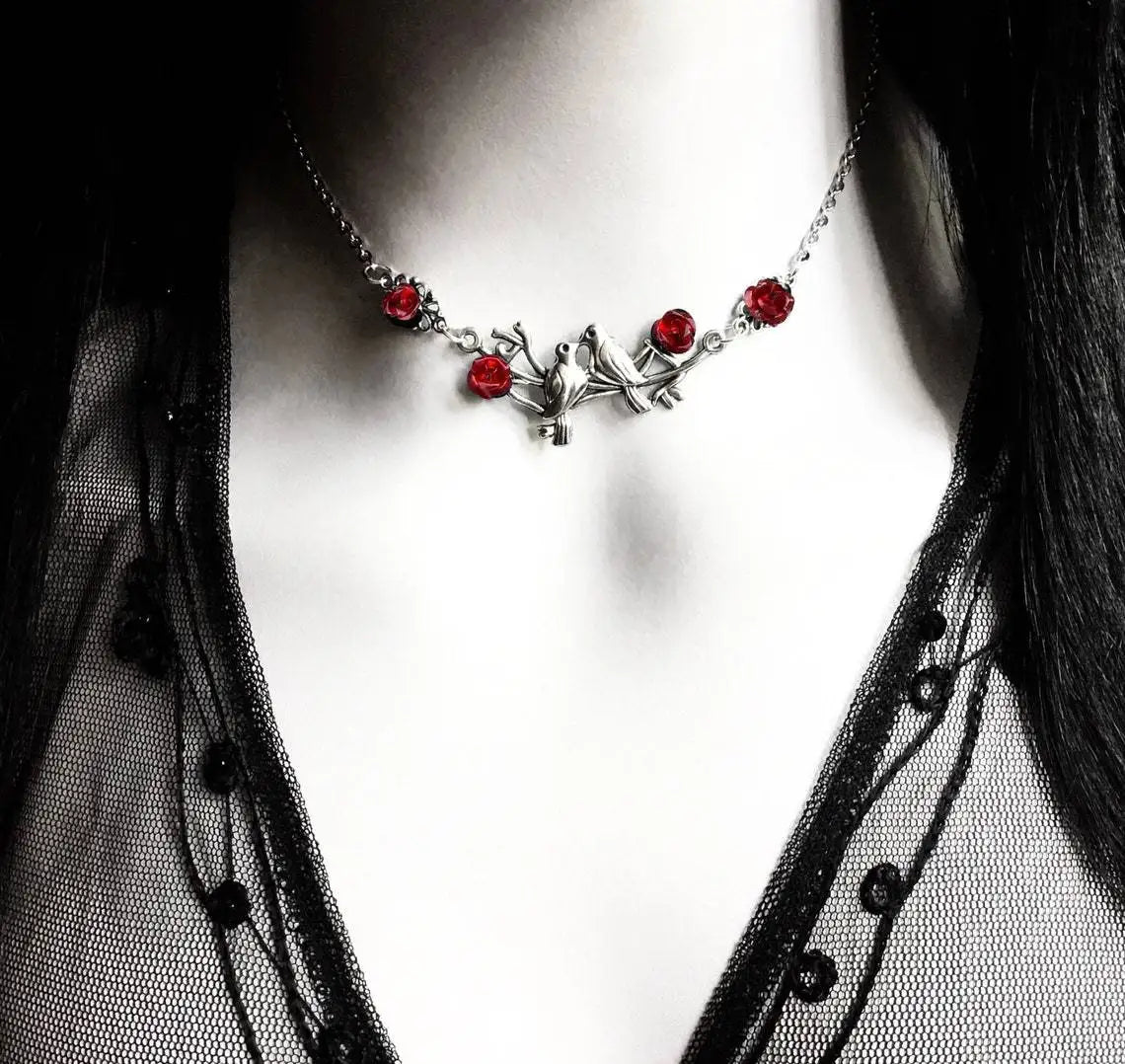 Charming bird and branch design combined with gothic black or vibrant red rose pendants